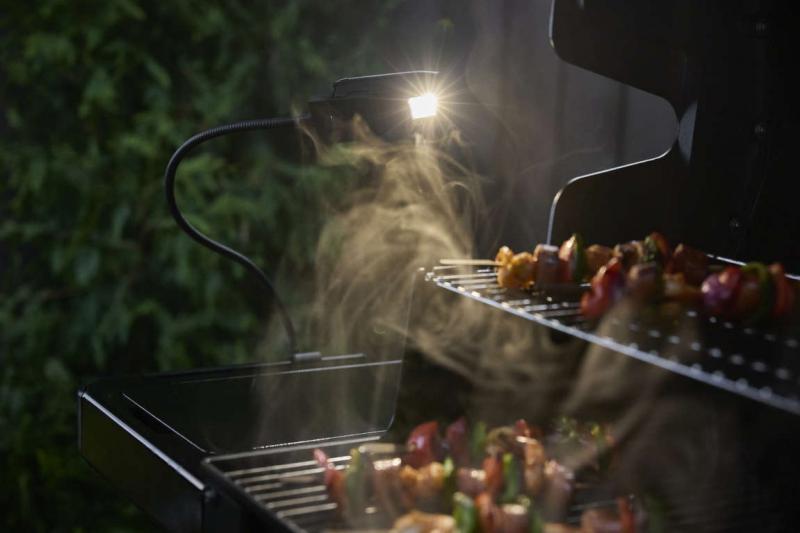 Lampada Grill ‘n Go. Si fissa facilmente alla maniglia del barbecue Weber® Q® e illumina la superficie di cottura. Il sensore di movimento si accende quando il coperchio viene sollevato e si spegne quando viene chiuso per risparmiare batteria (richiede 3 batterie AAA, non incluse). Rimovibile per essere utilizzata come torcia. Da € 59,99