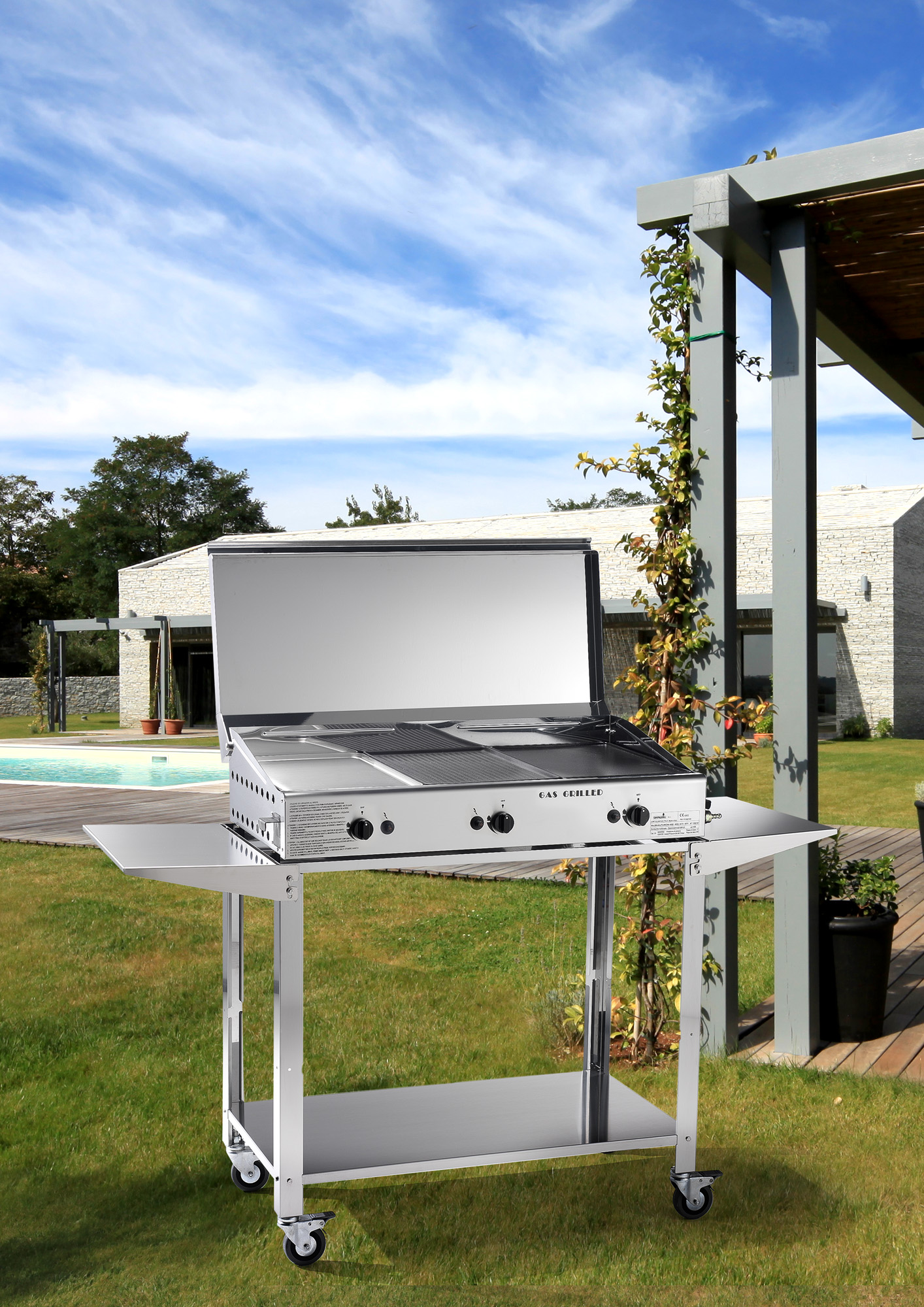 Master 4, grill a gas proposto da MCZ. Cottura combinata lava e piastra, quattro bruciatori in ghisa con accensione piezoelettrica. Carrello in robusto legno esotico.